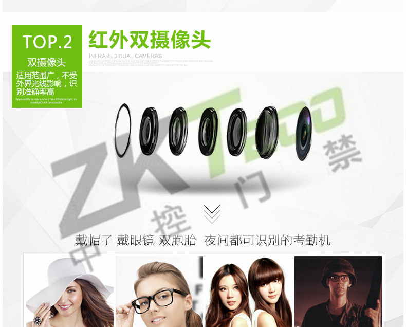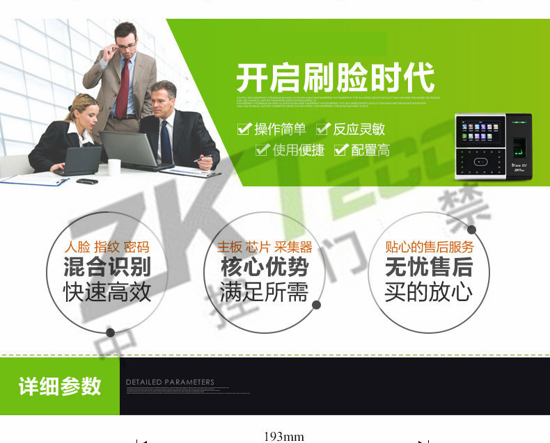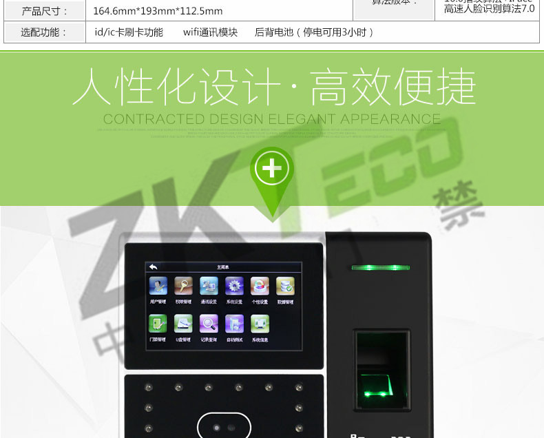 該產(chǎn)品采用了中控科技最新的ZEM600核心板,ZKFinger10.0指紋面部混合識(shí)別算法,容量大,識(shí)別速度快,集成高分辨率夜視紅外和彩色雙攝像頭功能,適用范圍廣,不受外界光線的影響,無論是在強(qiáng)光下還是在黑暗中也能進(jìn)行有效識(shí)別。該系列已經(jīng)通過了超過10萬面部數(shù)據(jù)庫長達(dá)2年的測(cè)試,同時(shí)該算法也在美國San Jose大學(xué)年度測(cè)試中名列前矛,在用戶舒適度方面獲得了最佳評(píng)分。iFace采用了嵌入式中控Multi-Bio CPU,主頻為630MHZ,可以處理高達(dá)1:20000的1:N速度,符合人體工程學(xué)的外觀設(shè)計(jì),工業(yè)設(shè)計(jì)由德國專業(yè)公司主導(dǎo)完成,模具采用了PC材料+蝕紋工藝+鏡面工藝,采集比對(duì)就如照鏡子一般,支持4.3寸全觸摸TFT,僅有6個(gè)狀態(tài)功能鍵,其它按鍵在TFT上全觸摸操作。標(biāo)配TCP/IP通訊方式,支持跨網(wǎng)段跨網(wǎng)關(guān)連接。