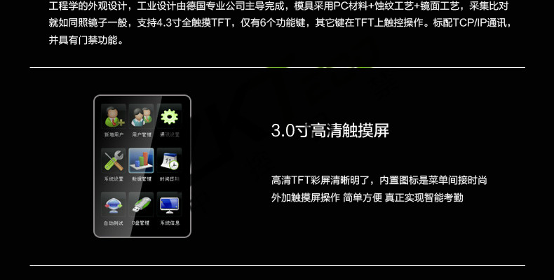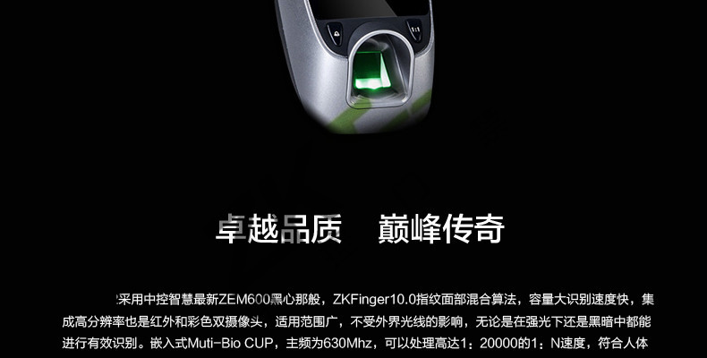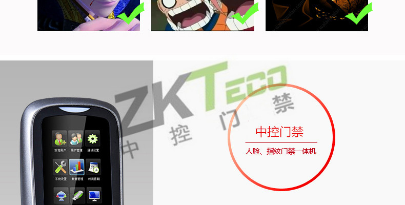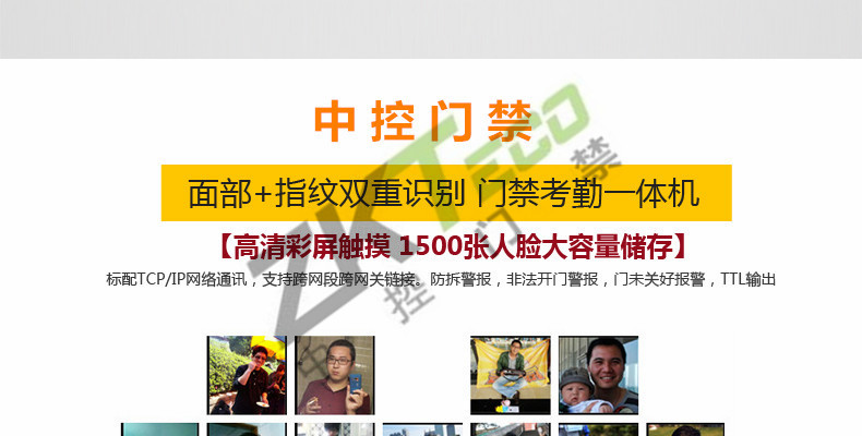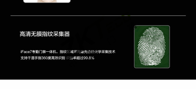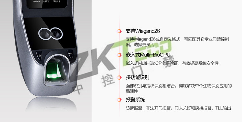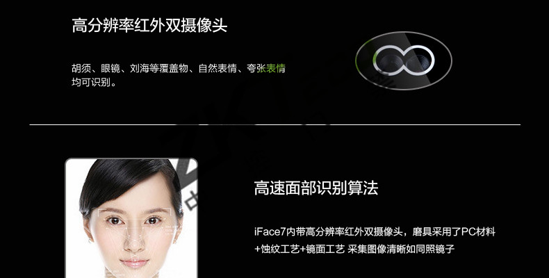 面部門禁一體機(jī)iFace7是基于ZEM800多媒體開發(fā)平臺(tái)設(shè)計(jì)的一款集指紋和面部混合驗(yàn)證的3寸觸摸彩屏門禁終端,采用ZKFinger VX10.0最新指紋算法及ZKFace VX7.0面部算法,識(shí)別速度快,靈活選擇面部、指紋或者密碼開門方式,集成高分辨率夜市紅外和雙攝像頭功能,適應(yīng)范圍廣。支持高級(jí)門禁功能(不同時(shí)間段開門,多人開門,拆機(jī)報(bào)警,門未關(guān)好報(bào)警,門被非法打開報(bào)警,開門按鈕輸入,有限門鈴接口,脅迫報(bào)警等)。標(biāo)配的TCP/IP通訊,支持跨網(wǎng)段跨網(wǎng)關(guān)連接,是安防工程的首先產(chǎn)品,可用于銀行、部隊(duì)、機(jī)場等高安全場所。