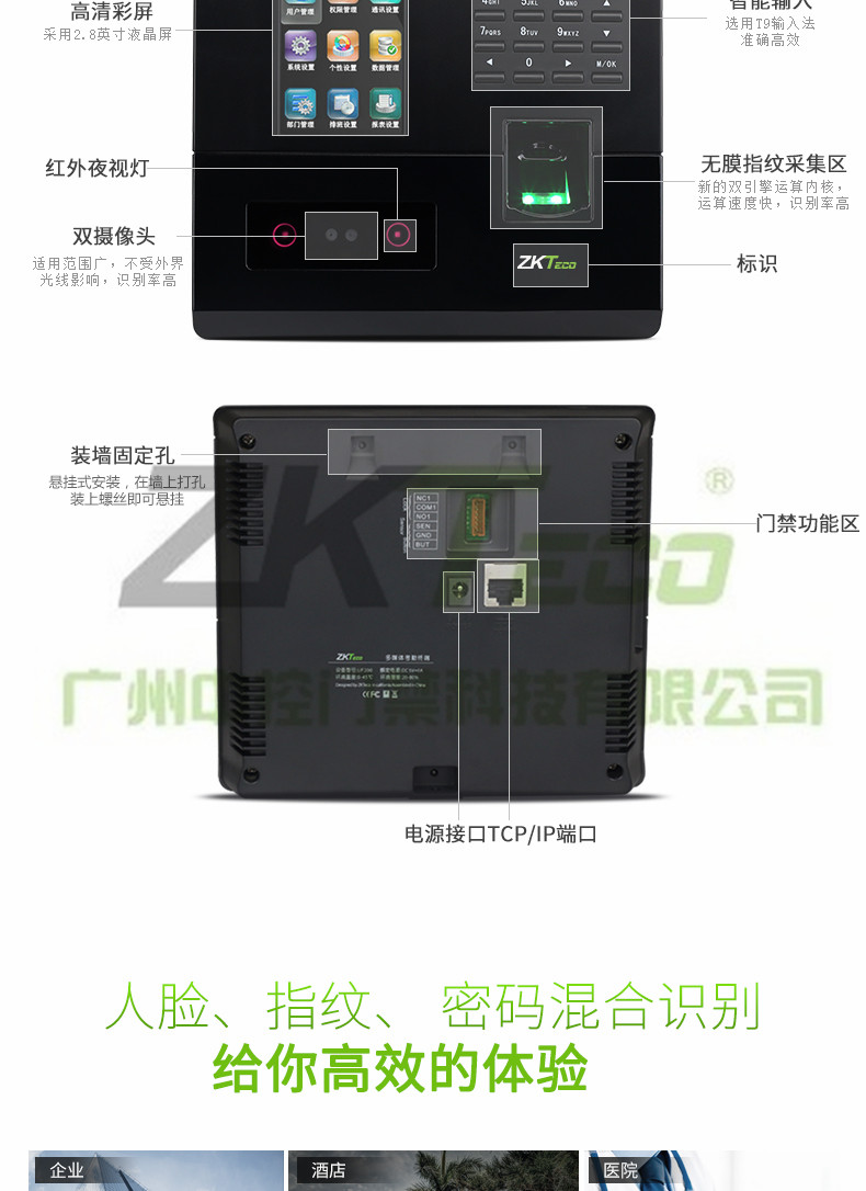 智能密碼門禁UF200特點(diǎn): 面部容量:200張 指紋容量:400枚 記錄容量:50000條 顯示屏:2.8寸彩屏 考勤速度:小于0.5秒 面部算法:ZKFace VX7.0 U盤功能:U盤上傳下載 考勤照片容量:3000張 通訊方式:USB-Client TCP/IP 其它功能:定時(shí)響鈴,9位碼、SSR,簡(jiǎn)單門禁功能 輸入法:T9輸入法 電源規(guī)格:DC5V 1A 使用濕度:0%-45% 使用溫度:20°C-60°C 尺寸:168(L)x151.5(W)x30(H)mm